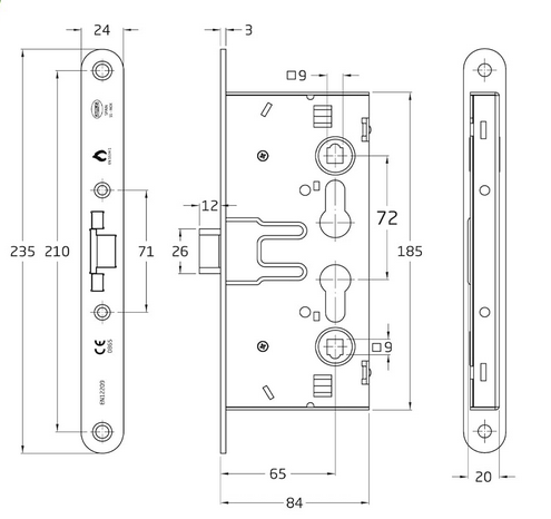 Atstumas nuo priekinės plokštelės iki cilindro centro 65 mm., atstumas tarp rankenos ir cilindro 72 mm.